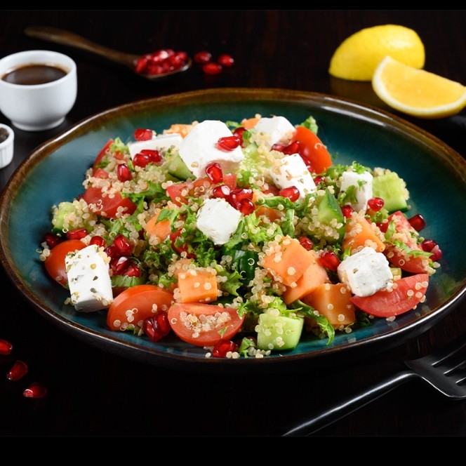 Kale, quinoa, cucumber, cherry tomatoes, sweet potatoes, feta cheese, pomegranate seeds, balsamic vinaigrette dressing