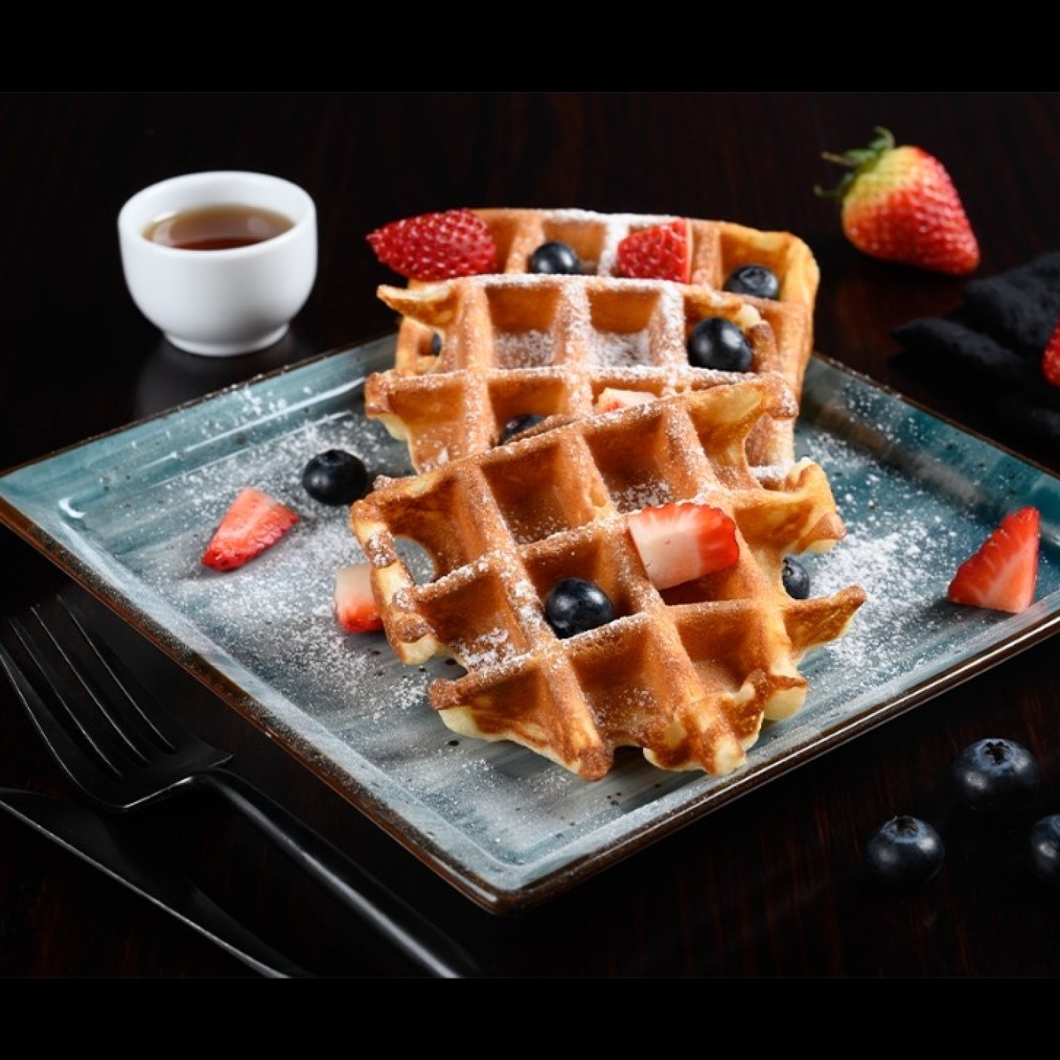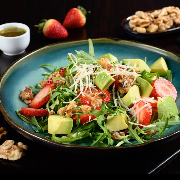 Avocado slices, strawberries, rocket leaves, walnuts, parmesan cheese, balsamic vinaigrette dressing