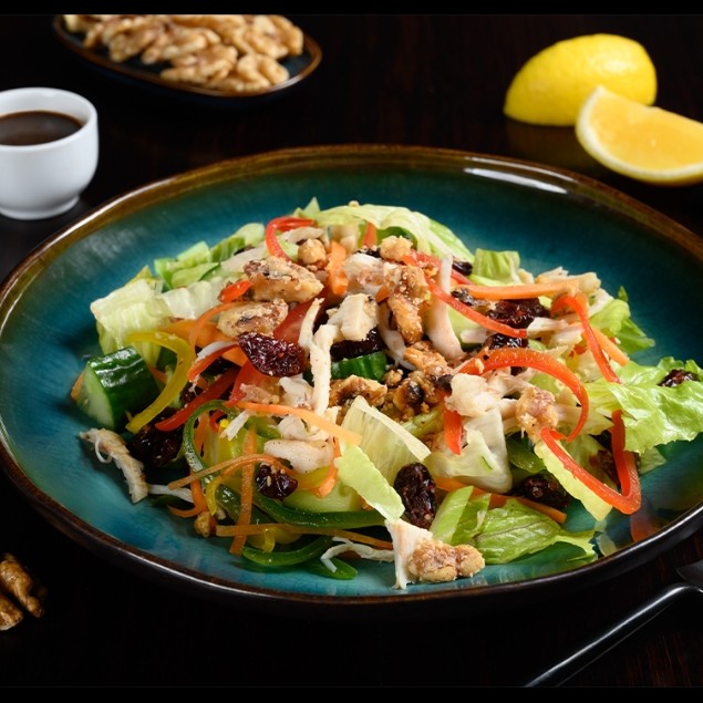 Roman lettuce, grilled chicken, carrots, cucumber, bell peppers, orange, dry cranberries, walnuts, honey citrus dressing