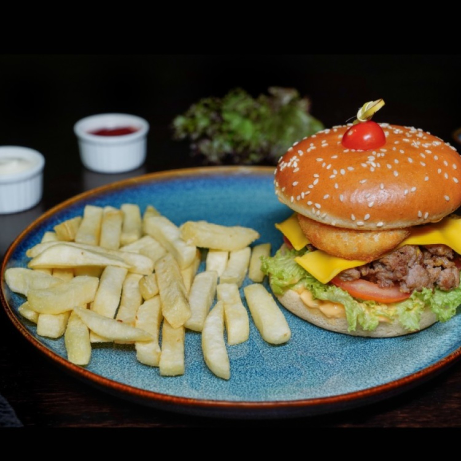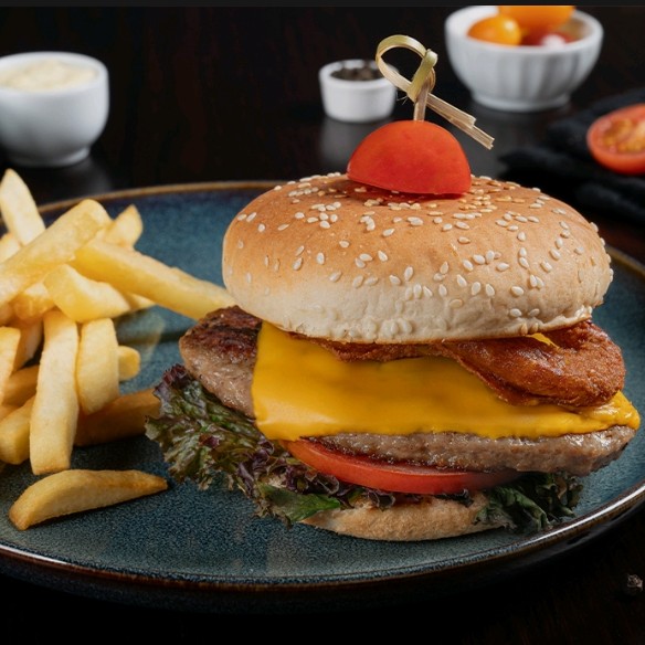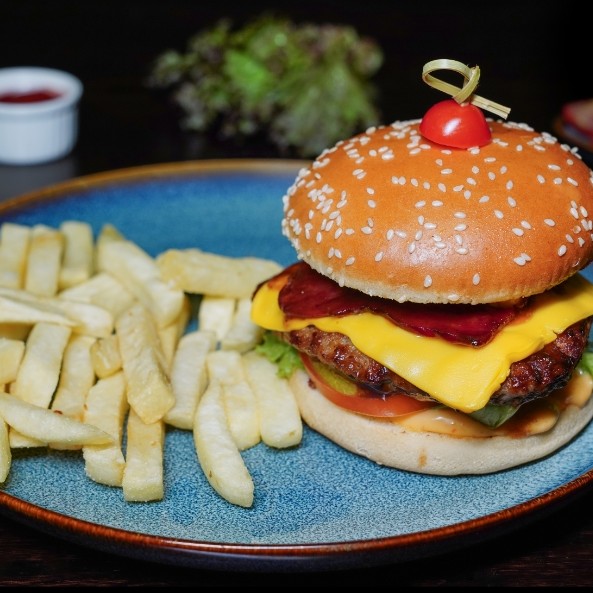 Beef patty, crispy beef bacon, tomato, gherkin, cheddar cheese, onion, rocket leaves, bbq sauce, french fries