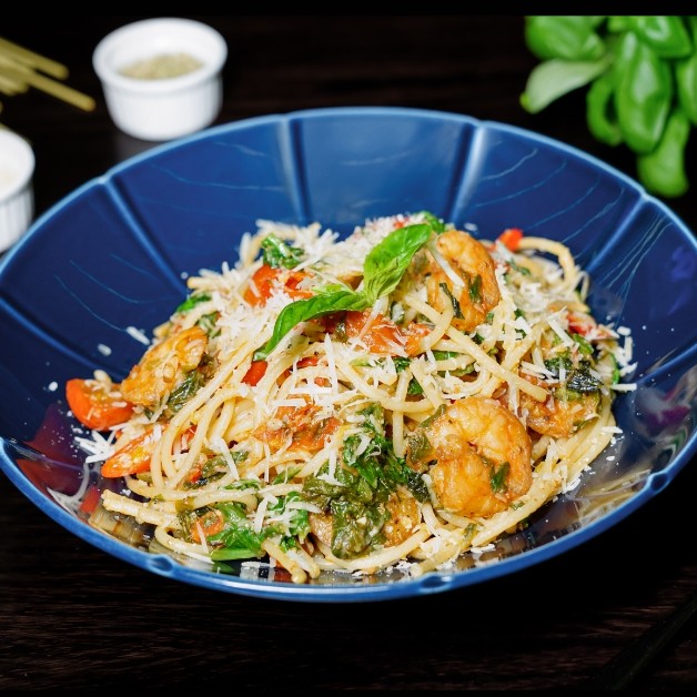 Sauteed shrimps, chili flakes, olive oil, garlic, cherry tomatoes, spinach, lemon, parmesan cheese