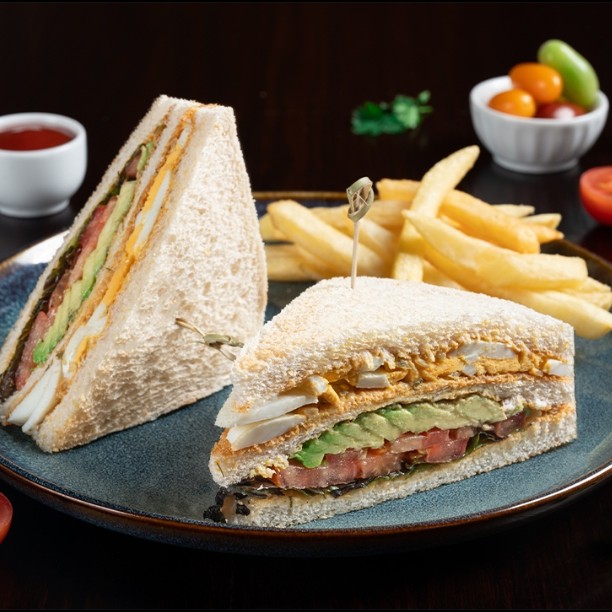 Toast bread, avocado, boiled eggs, lettuce, tomatoes, condiments sauce, french fries