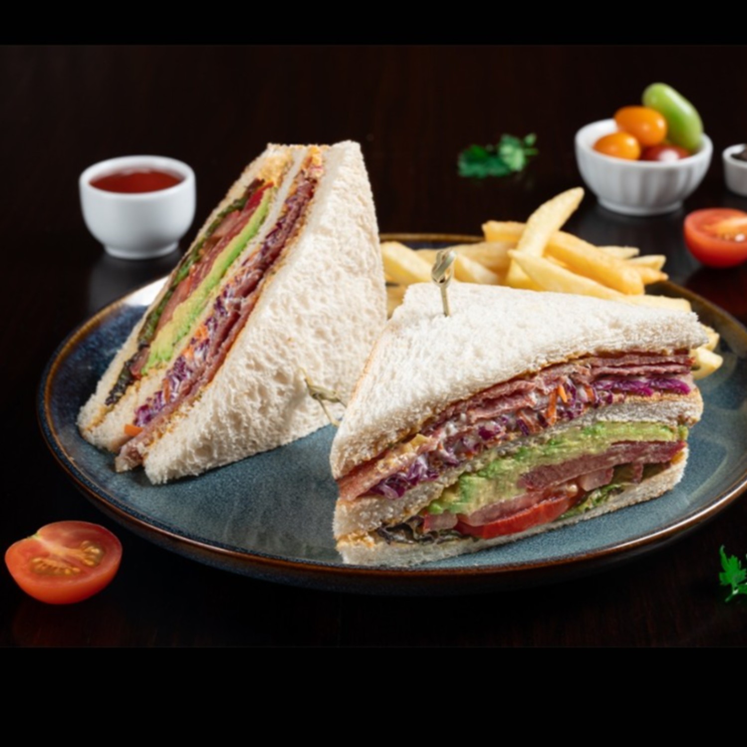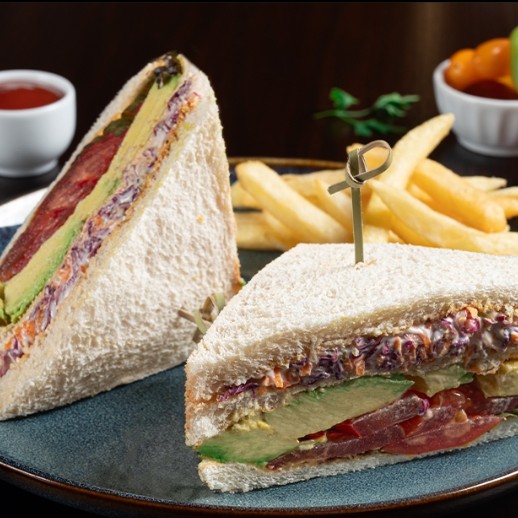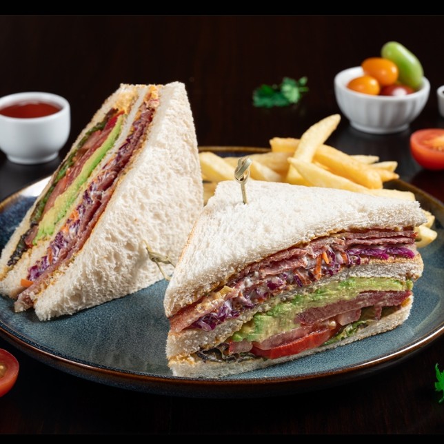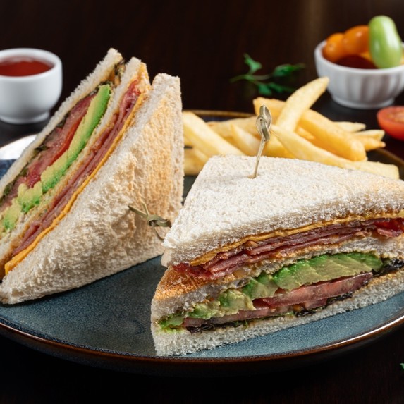Toast bread, smoked turkey bacon, lettuce, cheddar cheese, tomatoes, avocado, condiments sauce, french fries