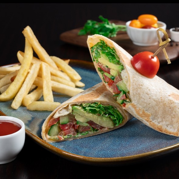Tortilla bread, tomatoes, cucumber, avocado, cheddar cheese, rocket leaves, sriracha sauce, french fries