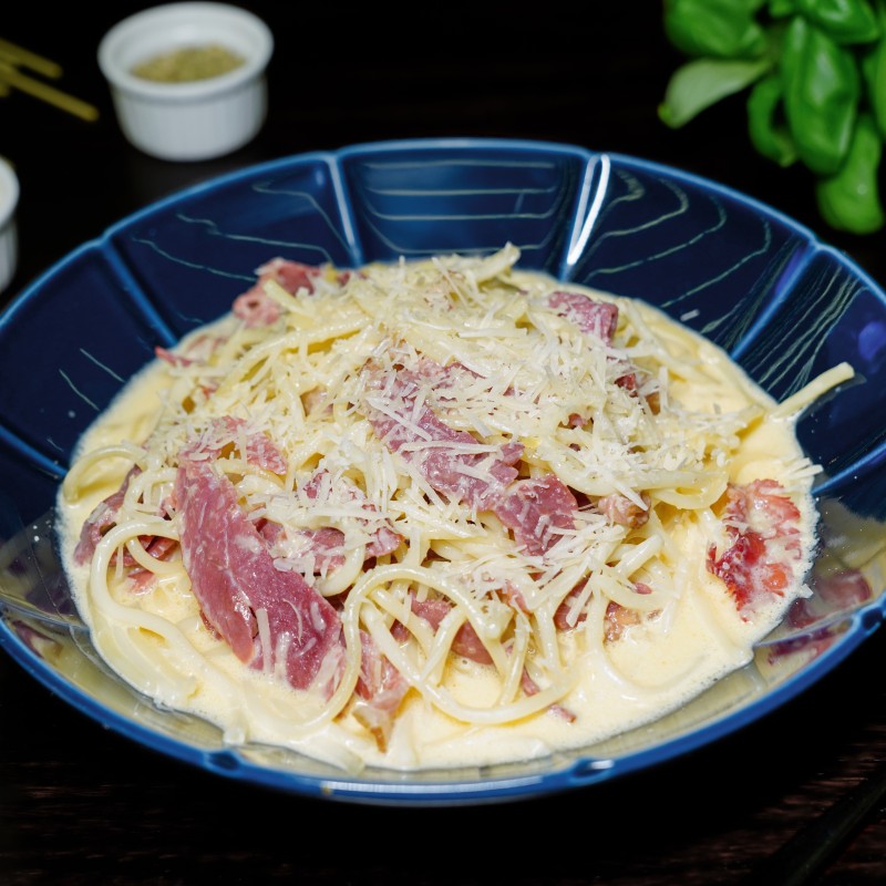 Beef bacon, cooking cream, egg yolk, chopped garlic, parmesan cheese