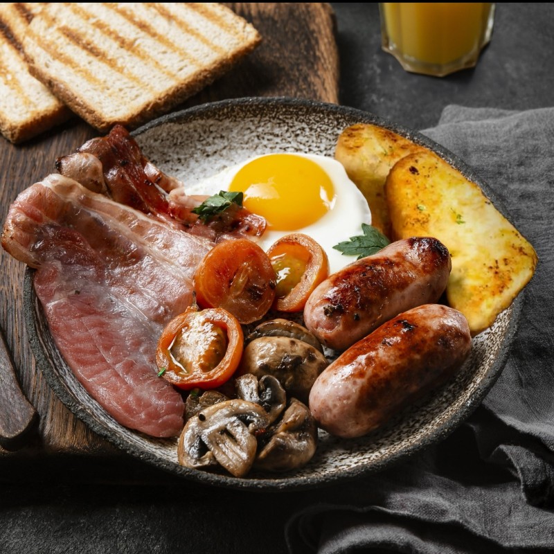 Eggs your choice, beef bacon, chicken sausage, hash browns, fried toast bread, fried tomatoes and mushrooms with small orange juice on the side choice of tea or coffee