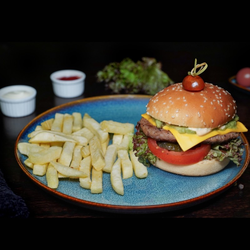 Beef patty, lettuce, tomato, gherkin, cheddar cheese, jalapeños, avocado sauce, sriracha sauce, french fries