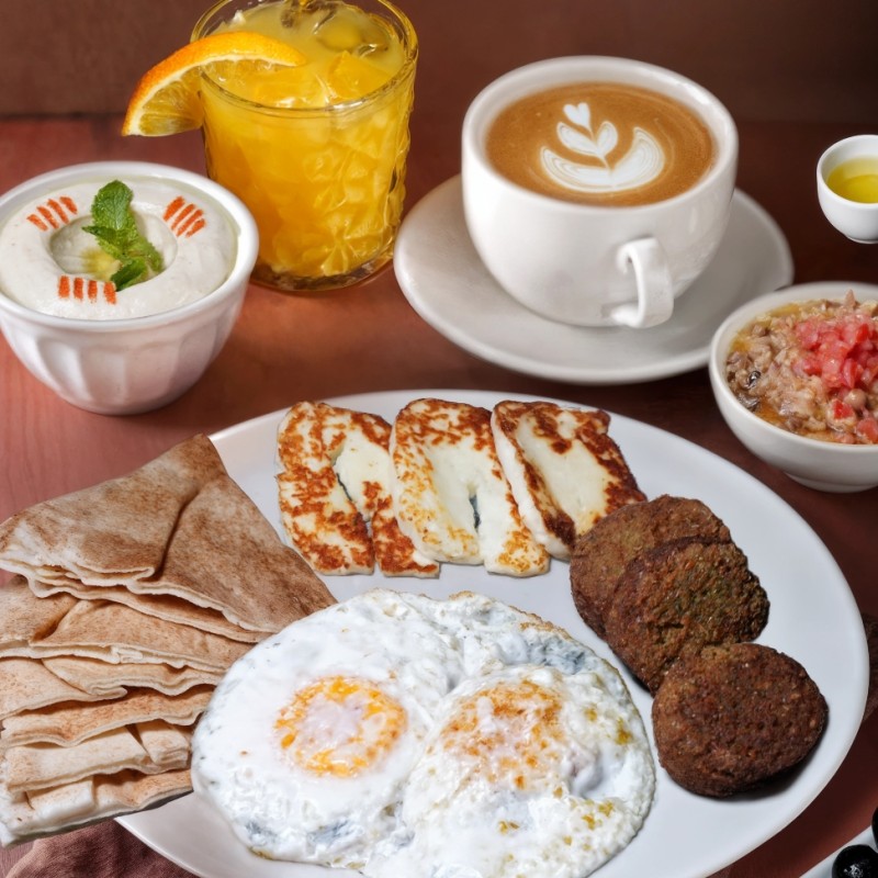 Eggs your choice, pita bread,hummus, falafel, ful medames, halloumi cheese and olives with small orange juice on the side choice of tea or coffee